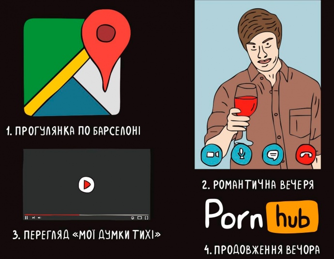 Оно начинается с прогулки Барселоной по Google-карте, продолжается распитием вина по видео и просмотром украинской комедии "Мои мысли тихие".