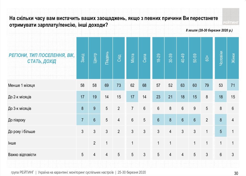 Справка: Социологическая группа "Рейтинг" провела опрос двумя волнами (I волна: 25-27 марта – 1000 респондентов, II волна: 28-30 марта – 1000 респондентов), опросив по тысяче человек в возрасте от 18 лет и старше во всех областях, кроме временно оккупированных территорий Крыма и Донбасса.