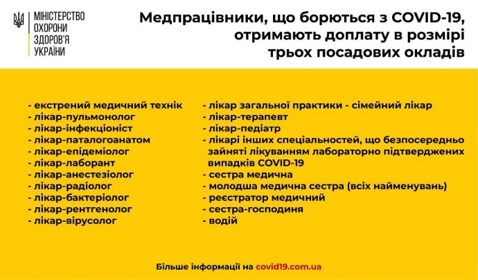 Уже за март медицинские работники Украины, занятые лечением пациентов с COVID-19, получат доплату в размере трех должностных окладов.