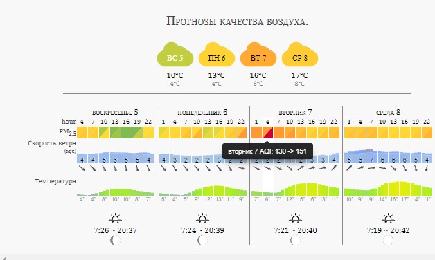 В период с 7 по 11 марта показатели AQI колебались от 54 до 123 ед., с 16 до 21 марта - от 52 до 121, с 25 до 30 марта - от 74 до 154 ед., с 1 по 5 апреля - от 57 до 153 ед.