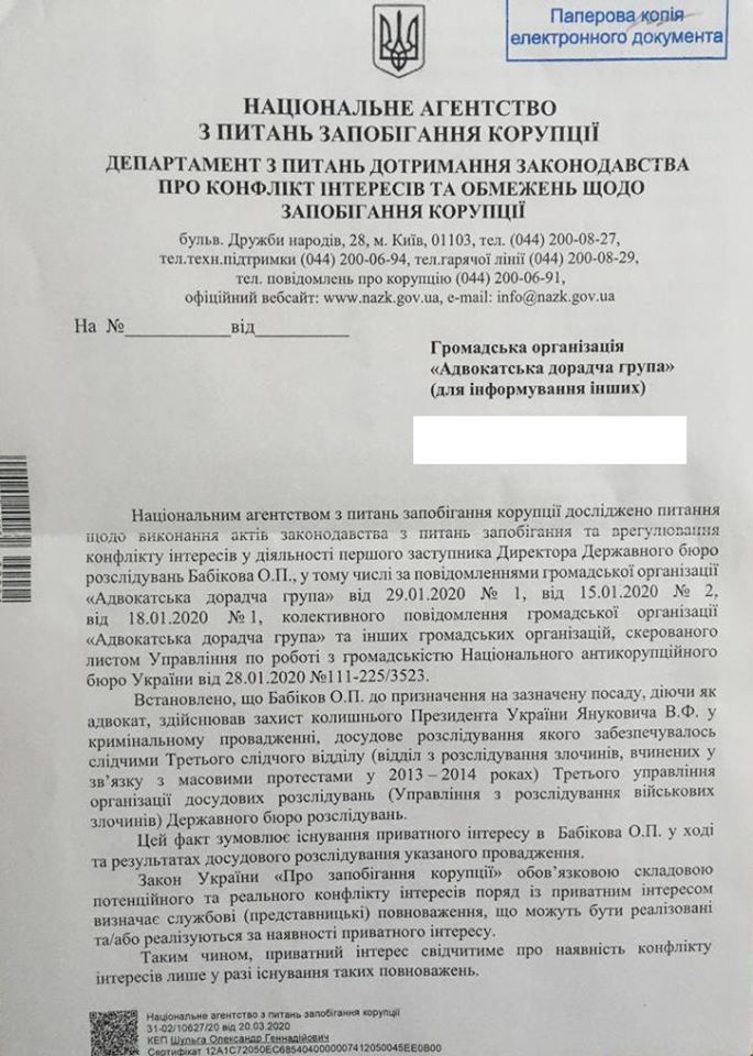 Дословно в документе: "Установлено, что Бабиков А.П. до назначения на указанную должность, действуя в качестве адвоката, осуществлял защиту бывшего Президента Украины Януковича В.Ф. в уголовном производстве, досудебное расследование которого обеспечивалось следователями Третьего следственного отдела (отдел по расследованию преступлений, совершенных в связи с массовыми протестами в 2013-2014 годах) Третьего управления организации досудебных расследований (Управление по расследованию военных преступлений) Государственного бюро расследований.
