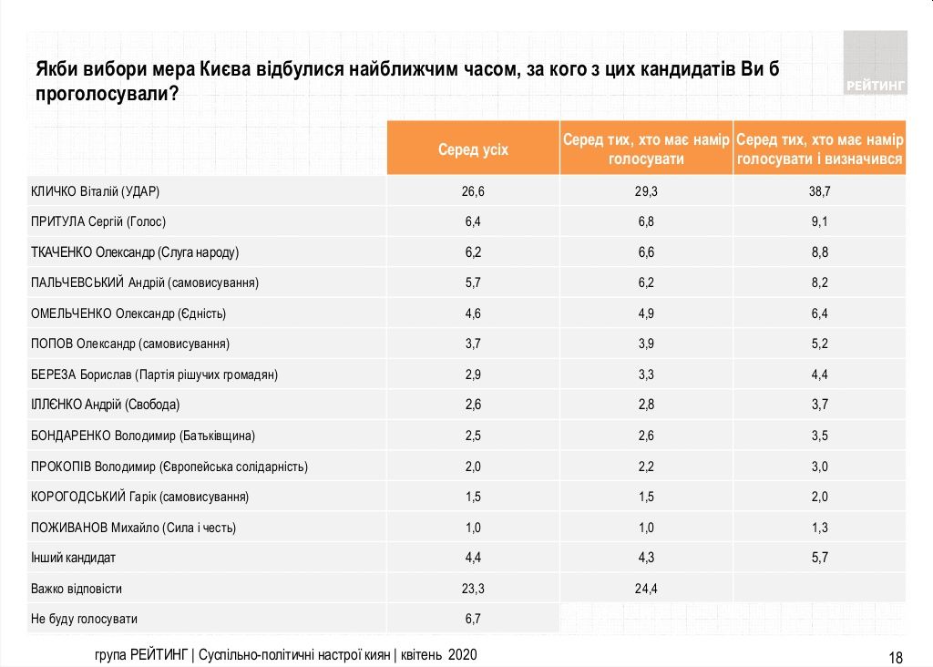 Лидером среди кандидатов на должность городского главы Киева является Виталий Кличко, он опережает Сергея Притулу и Александра Ткаченко в предпочтениях избирателей.