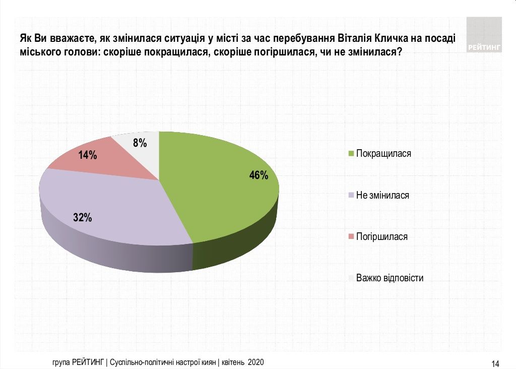 46% киевлян считают, что ситуация в столице во времена мэрства Кличко улучшилась, а 32% утверждают, что она не изменилась.