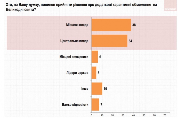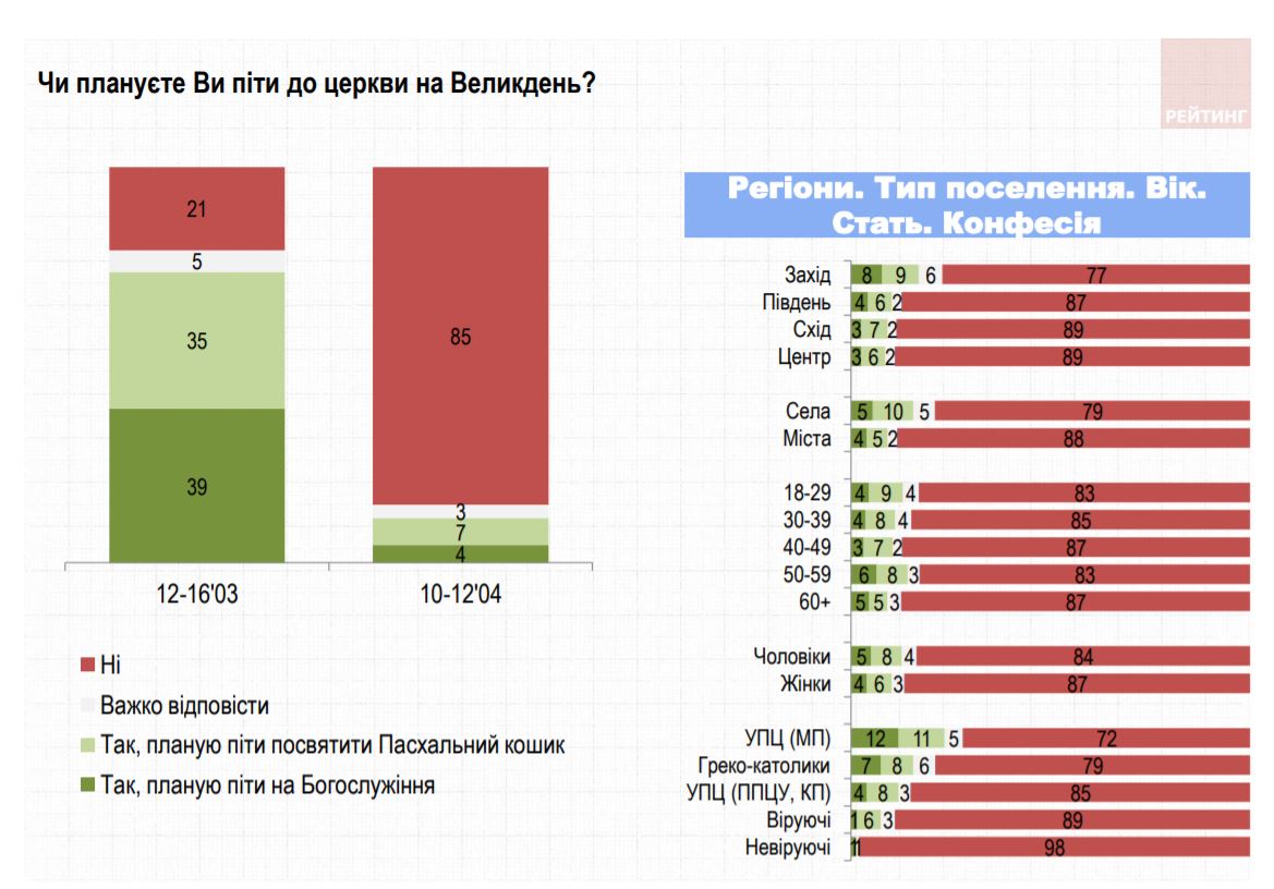 Накануне Пасхальных праздников 85% украинцев рассказали, что не планируют идти в церковь на праздник, месяц назад не планировали идти в церковь лишь 21% респондентов.