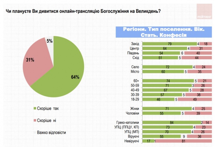 В то же время 64% респондентов заявили, что планируют смотреть онлайн-трансляции богослужений на Пасху, 31% - не планируют.