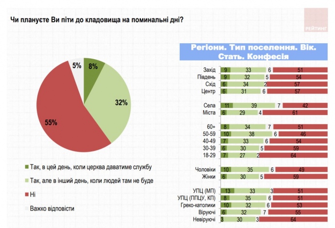 При этом 55% опрошенных рассказали, что не намерены идти на кладбище на поминальные дни, 8% - хотят пойти в день, когда церковь будет давать там службу, а 32% отметили, что пойдут на кладбища не в праздники, а в другие дни, когда там не будет людей.
