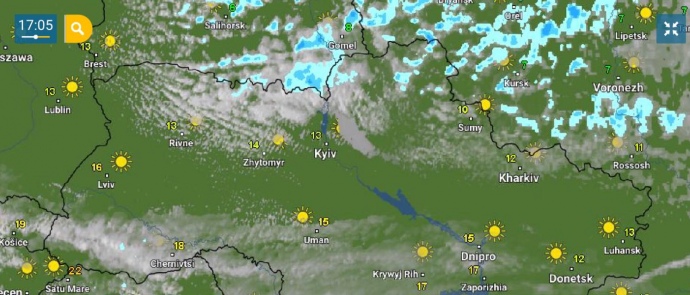 Вдоль северной границы Украины собираются дождевые облака, которые могут потушить пожары, дым от которых идет на столицу.