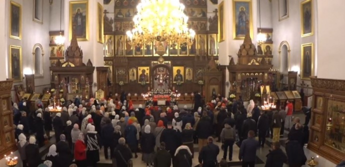 На телеканале NewsOne вели трансляцию указанного богослужения. На скиншотах, которые опубликовал ресурс "Униан" видно, как плотно стоят прихожане.