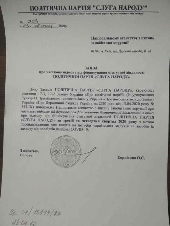 - В конце марта в партии "Слуга народа" сделали громкое политическое заявление об отказе от госфинансирования за год в пользу борьбы с коронавирусом.