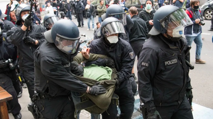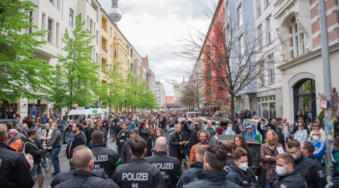Несмотря на запрет демонстраций из-за коронавируса, более тысячи человек собрались протестовать против нынешних ограничений. Многие из демонстрантов стояли перед барьерами, которые полиция установила вокруг Площади Розы Люксембург, чтобы предотвратить массовое скопление людей.