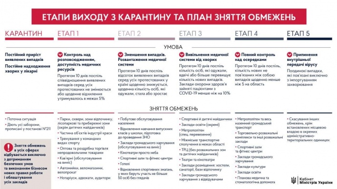 Что предшествовало: Кабинет министров Украины продлил введенные в стране карантинные мероприятия до 11 мая. С 12 мая, при условии заполнения больниц пациентами с COVID-19 менее чем на 50% и сохранения процента выявленных случаев заболевания в стране в пределах 5% в течение 10 дней, будет запущен пятиэтапный план выхода страны из карантина.