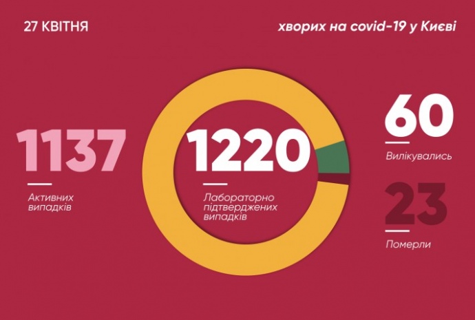 Прямая речь: "Количество киевлян, у которых за прошедшие сутки лабораторно подтвердили заболевание коронавирусом, увеличилось еще на 32 человека. Двое из них - медики. Один случай за минувшие сутки, к сожалению, летальный. Всего в столице от коронавируса умерли 23 человека. Подтвержденных случаев заболевания COVID-19 на сегодня - 1220".