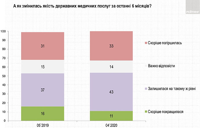 Сейчас 43% опрошенных считают, что качество государственных медуслуг за последние 6 месяцев осталась на таком же уровне. 33% считают, что оно скорее ухудшилось, 11% – скорее улучшилось.