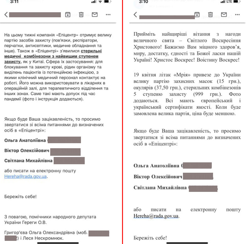 Дословно из письма: "Уважаемый Виталий Владимирович! На прошлой неделе самолет "Мрия" доставил в Украину большую партию медицинских масок, очков, стерильных комбинезонов 5 степени защиты, а также другие товары противоэпидемического назначения. Все они имеют европейский и украинский сертификаты качества. Когда будет заказана большая партия, цена будет меньше (прайс товаров прилагается). Если будет ваша заинтересованность, то просим вас обращаться со всеми вопросами к определенным лицам в компании "Эпицентр К".