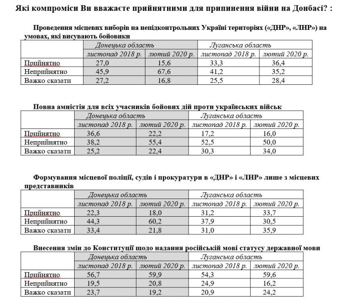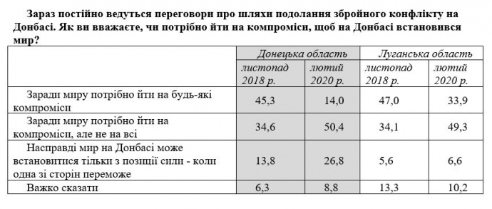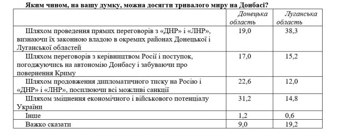 Такой уровень был очень высоким в Луганской области (где 71% опрошенных считают такие переговоры приемлемыми) и довольно высоким в Донецкой области (уровень поддержки составлял 49%); о недопустимости такой перспективы заявили 33% жителей Донецкой области и лишь 9% луганчан".
