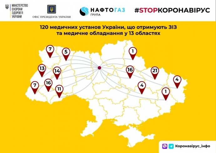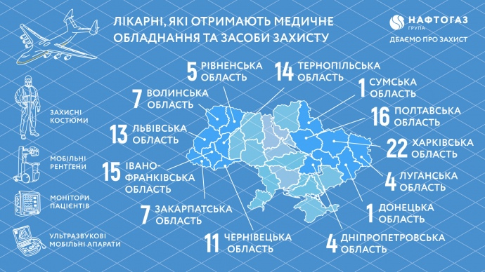 120 украинских больниц получат благотворительную помощь, доставленную "Нафтогазом", – это, в частности, защитные костюмы, мониторы пациентов, мобильные рентгены и ультразвуковые аппараты.