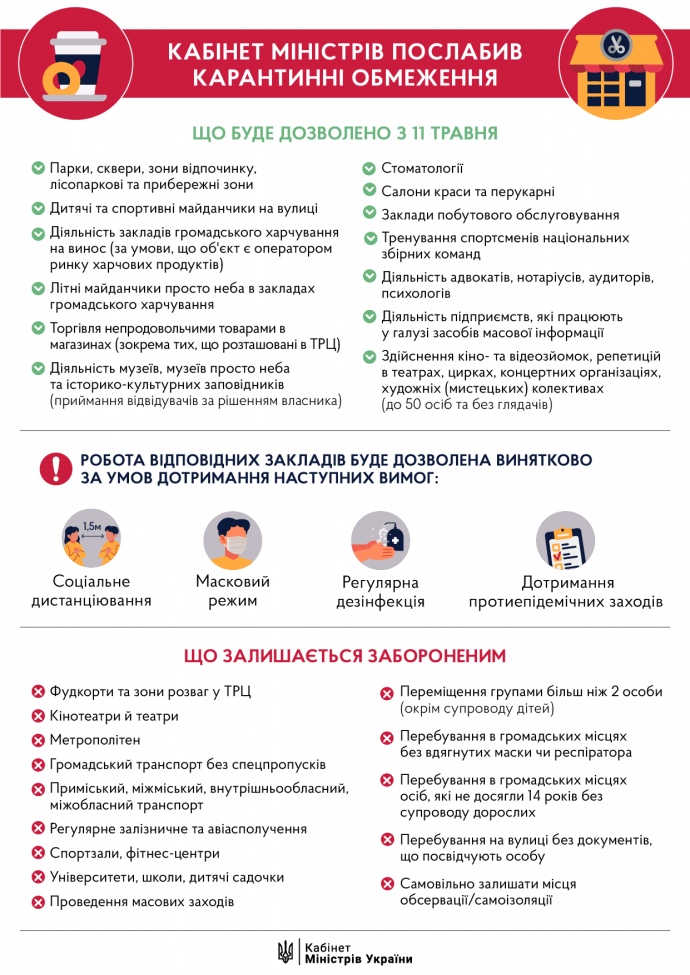 - 4 мая Кабинет министров продлил действие карантина в Украине до 22 мая. При этом правительство решило отменить с 11 мая ряд ограничений.