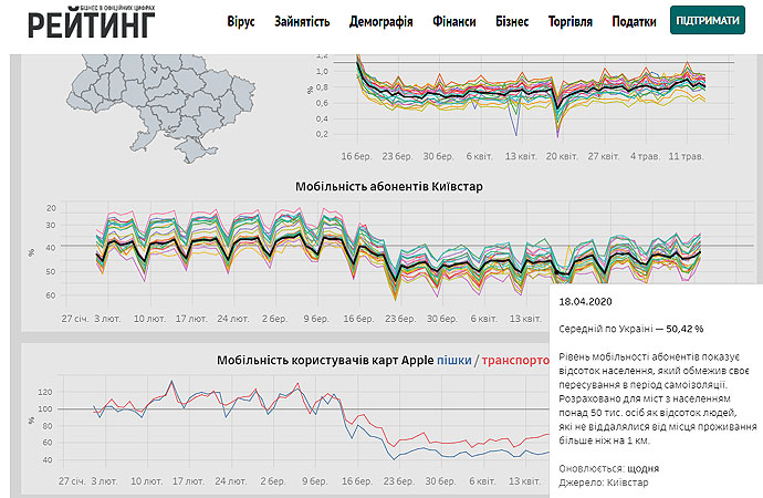 Детали: По словам Дубилета, агрегированные данные по мобильности абонентов получают благодаря поддержке компании Киевстар, также учитывают данные по использованию банковских карт и данные Apple.