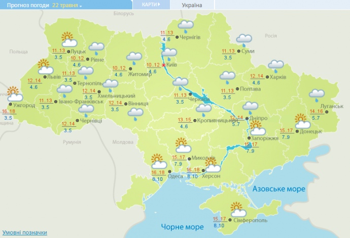 Температура ночью 4-9°, 21 мая на юге страны 9-14°, днем 14-19°; 22 мая в западных, северных и центральных областях ночью 1-6° тепла, на поверхности почвы, в Карпатах и в воздухе заморозки 0-3°, днем 9-14° тепла.