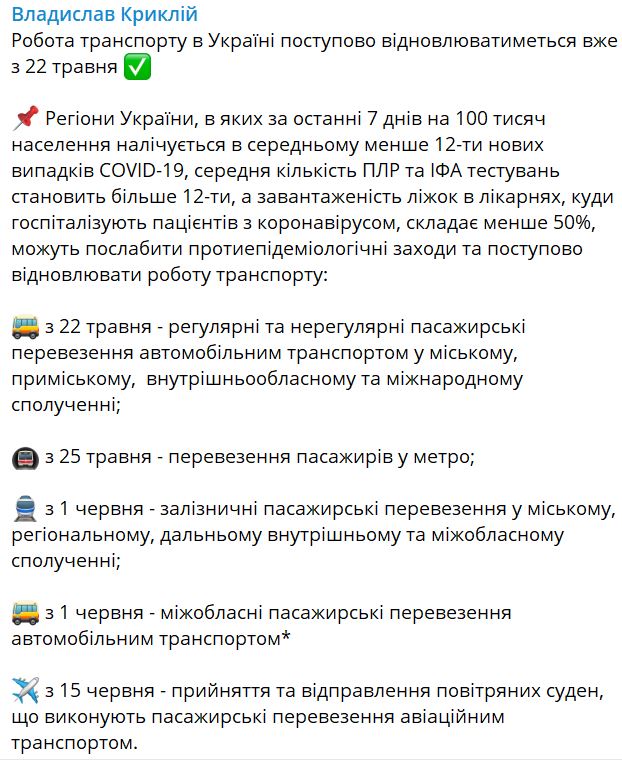 Это ослабление карантина также прокомментировал министр инфраструктуры Владислав Криклий.