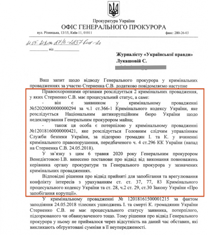 Позже прокуратура ответила на запрос УП, что отвода Венедиктовой в деле против Стерненко не было.