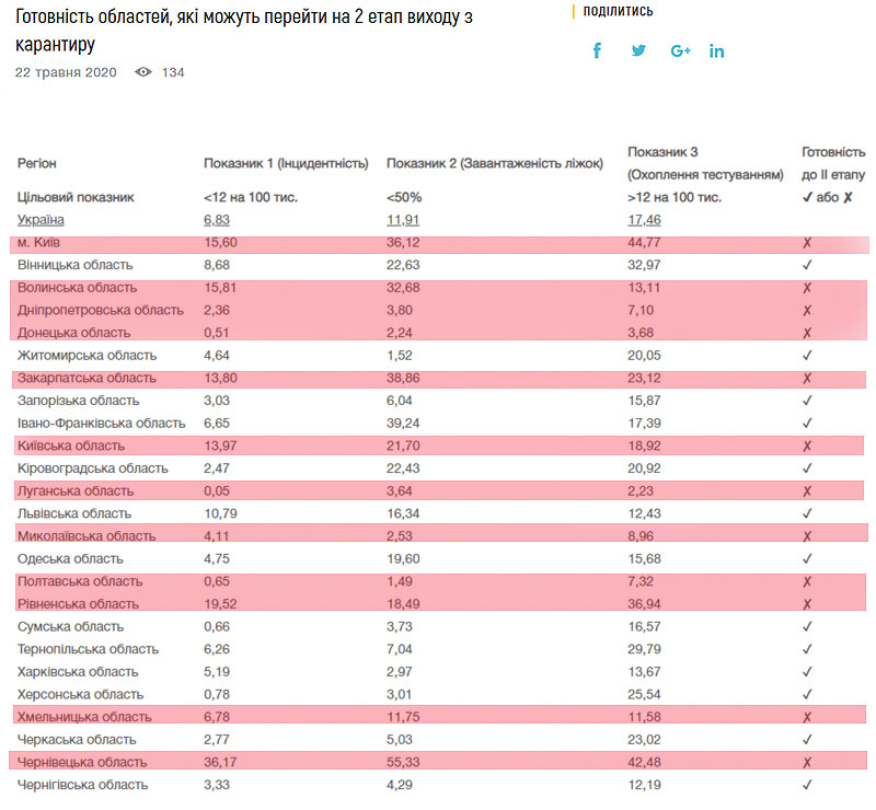 По состоянию на 22 мая 11 областей Украины не готовы перейти ко 2 этапу снятия карантинных ограничений, введенных в связи с коронавирусом.