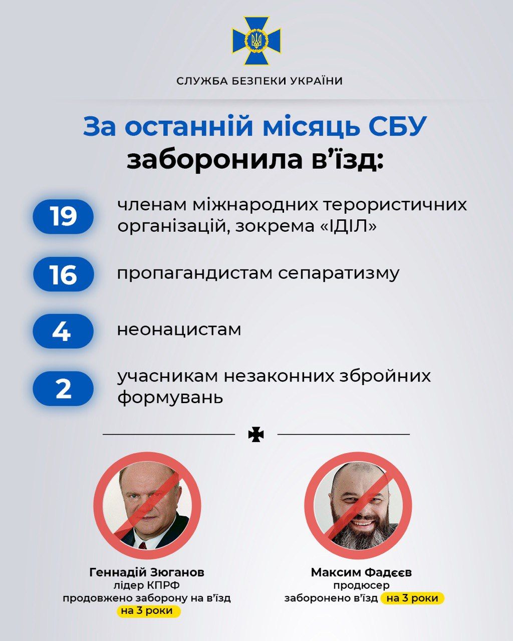 За последний месяц Служба безопасности Украины запретила въезд на территорию государства 41 иностранцу, среди которых известные россияне Геннадий Зюганов и Максим Фадеев.