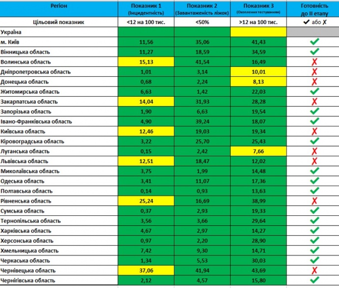 По данным Минздрава по состоянию на 24 мая, не соответствуют критериям для ослабления карантина по этим показателям 9 областей – Волынская, Днепропетровская, Донецкая, Закарпатская, Киевская, Луганская, Львовская, Ровенская и Черновицкая.