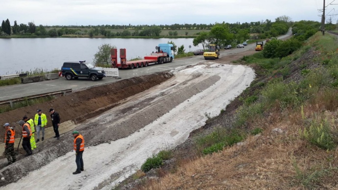 Прямая речь Москаленко: "Пока будут продолжаться восстановительные работы, приняли решение смонтировать временную переправу, чтобы водители не делали значительный крюк по объездной дороге. Сейчас вблизи разрушенного моста готовят "дорожную подушку" под будущий понтонный - отсыпают шлак.