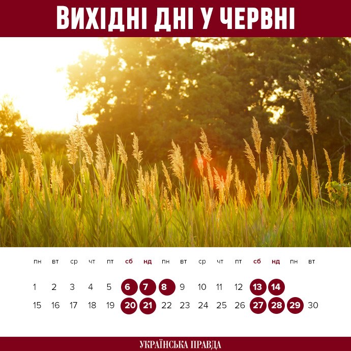 Детали: В связи с тем, что религиозный праздник Троица и государственный праздник День Конституции Украины выпадают на воскресенье, три выходных дня подряд будут с 6 по 8 июня и с 27 по 29 июня.