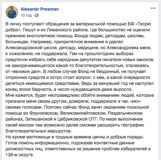 Прямая речь: "В личку поступают обращения за материальной помощью БФ "Творю добро" (благотворительный фонд Пресмана – УП). Пишут и из Лиманского района, где большинство не оценили прежнюю многолетнюю помощь Фонда людям, детсадам, школам, больницам...