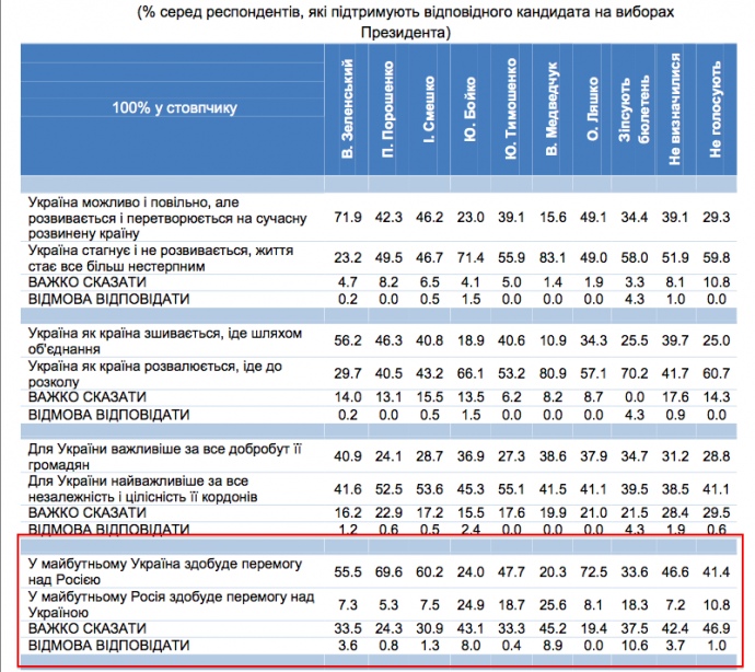 Также вариант о победе Украины выбирают больше всего респонденты, которые являются избирателями Олега Ляшко, Петра Порошенко, Владимира Зеленского и Игоря Смешко.