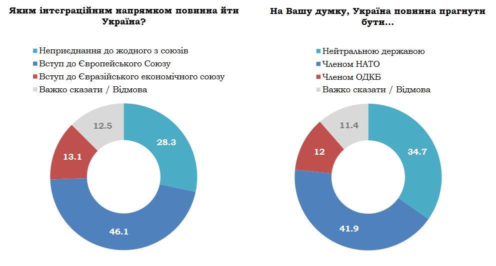 41,9% респондентов полагают, что Украина должна стремиться стать членом НАТО, 34,7% считают, что государство должно быть нейтральным.