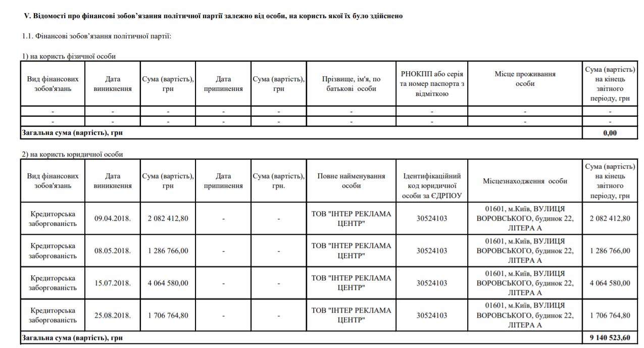 Дословно: "Партия "Оппозиционный блок" в финансовом отчете за I квартал 2020 отметила, что за этот период не получала никаких средств, зато имеет долг перед ООО "Интер реклама центр" на 9,1 миллиона гривен".