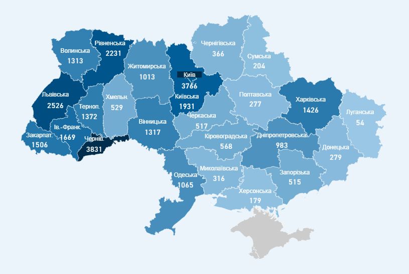 В Киеве за последние сутки подтвердили коронавирус 95 людям (в Киевской области – 12), во Львовской области – 112, в Винницкой – 81, в Ровенской – 56, в Харьковской – 52, в Волынской – 47, в Черновицкой – 38, в Закарпатской – 35.
