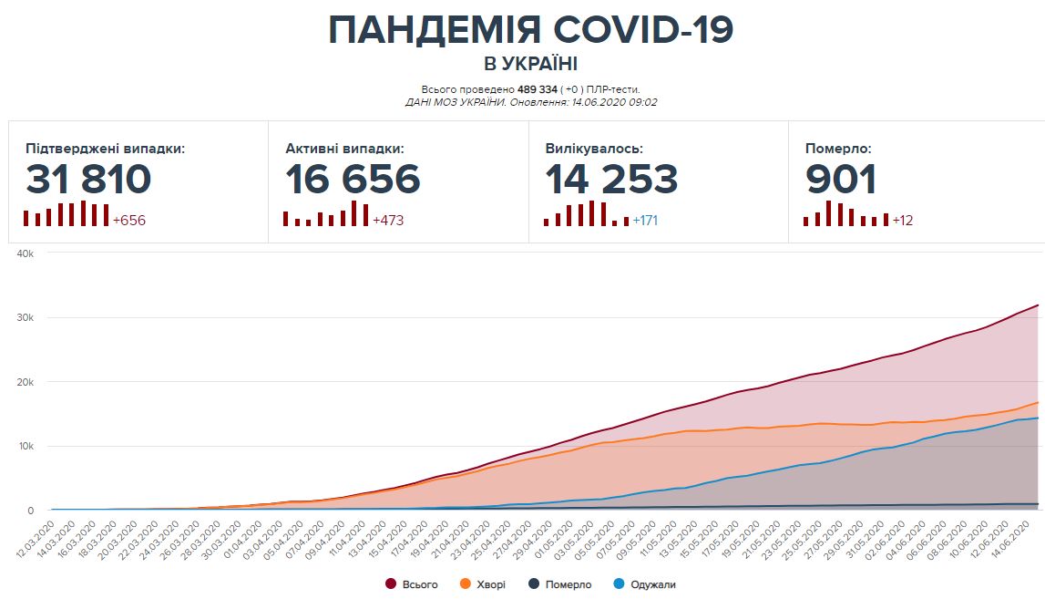За воскресенье 14 июня COVID-19 в Украине диагностировали у 656 человек, 171 человек выздоровел, 12 больных умерли.