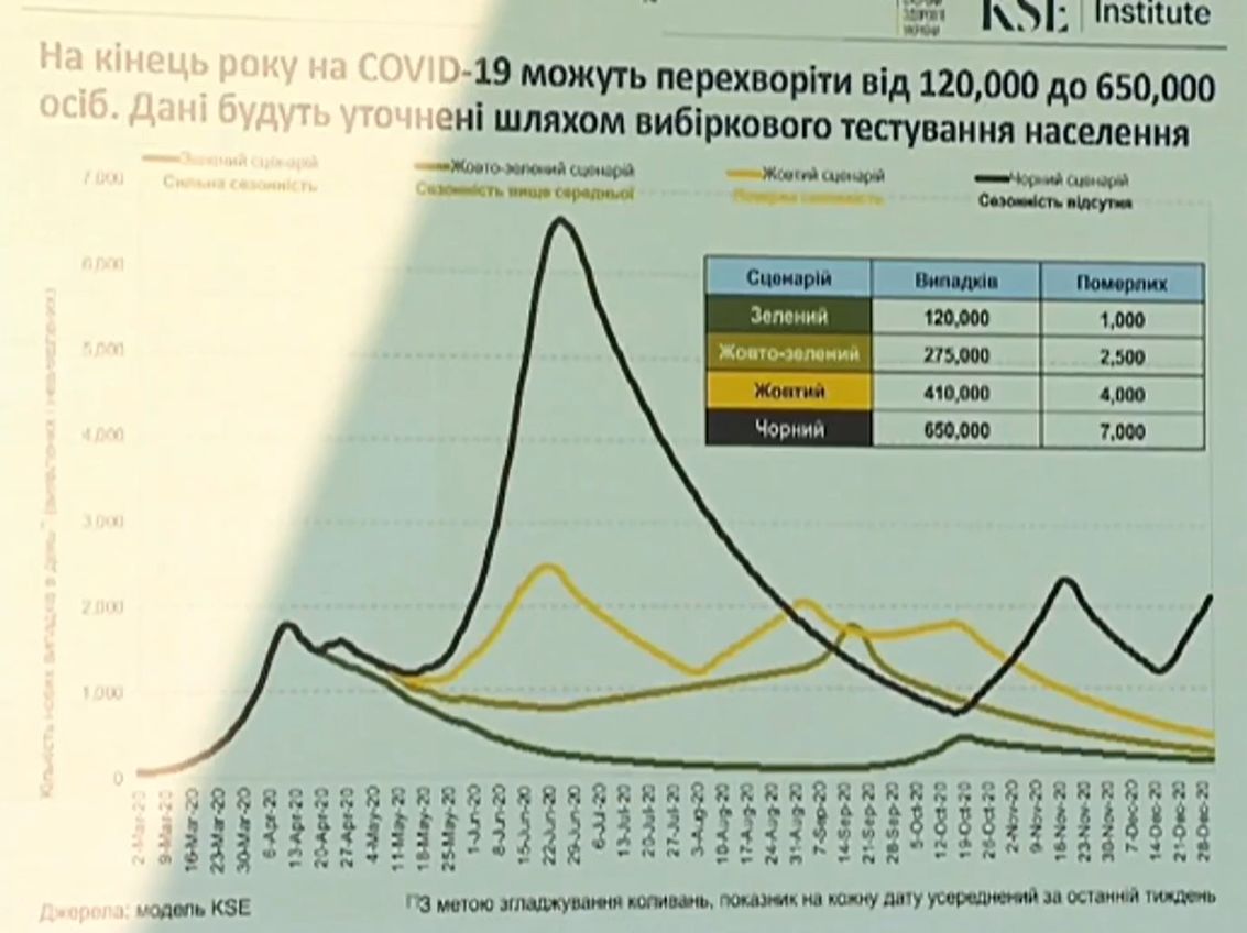 Эксперты просчитали 81 сценарий развития эпидемии в Украине, сейчас ретроспективно выбрали три "самых оптимистичных", которые учитывают сезонность в летнее время. Это "черный", "желтый" и "зеленый" сценарии.