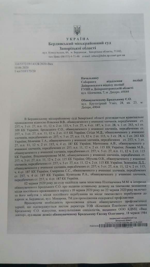 Детали: Судебные разбирательства по делу продолжаются, обвиняемый находится под домашним арестом. Однако в решении указывается, что в суд с соответствующим ходатайством обратился адвокат обвиняемого, отметив, что Евгению Бродскому якобы необходимо пройти "оздоровительную профилактику" в городе Бердянск. По адресу, который указал защитник, находится база отдыха Sun resort.