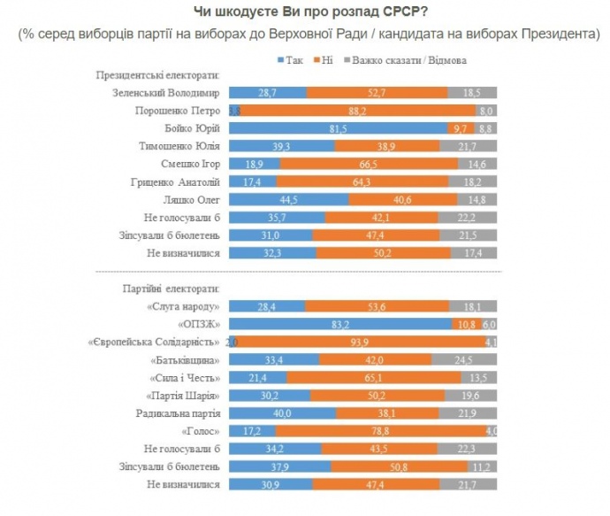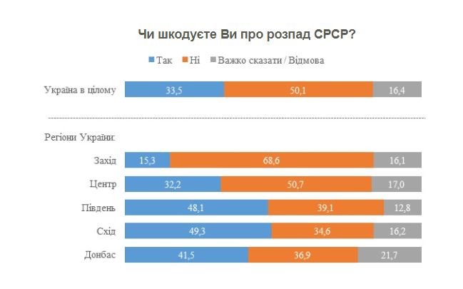 Детали: Отмечается, что если на Западе Украины подавляющее большинство населения не жалеют о распаде СССР (69% против 15%), то в Центре Украины соотношение - 51% к 32%.