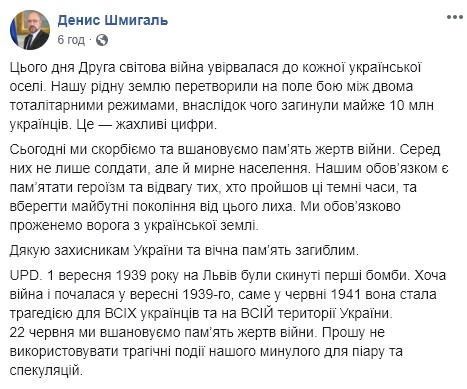 Позже он обновил сообщение, объяснив, что "1 сентября 1939 на Львов были сброшены первые бомбы. Хотя война и началась в сентябре 1939, именно в июне 1941 она стала трагедией для всех украинцев и на всей территории Украины".