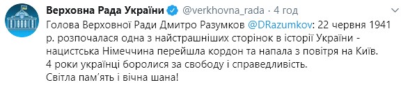 Похожее сообщение опубликовала пресс-служба парламента от имени спикера Дмитрия Разумкова: "22 июня 1941 началась одна из самых страшных страниц в истории Украины".
