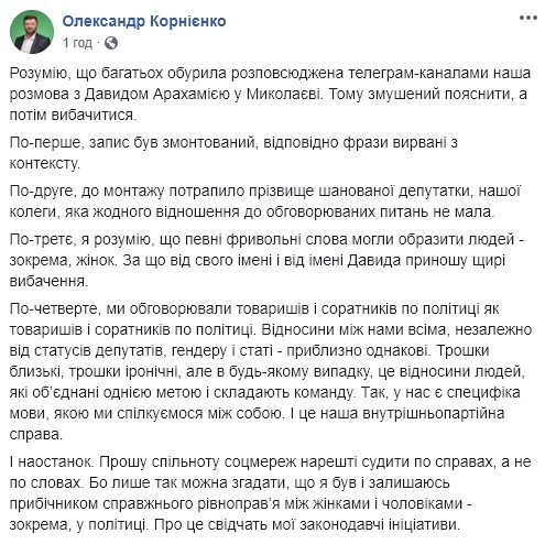 Корниенко сообщил в фейсбуке, что ролик смонтированный, а фразы "вырваны из контекста".