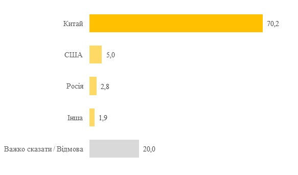 Половина респондентов (49%) затруднились ответить. В то же время, 26% считают, что Китай ответственный за разработку и умышленное распространение коронавируса, далее следуют США (11%) и Россия (2%). Другие ответы назывались реже.