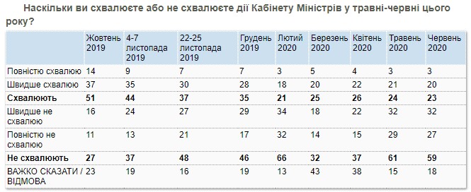Детали: При этом 23% опрошенных в июне одобряют действия Кабинета министров (24% в мае), 59% - не одобряют (61% в мае).