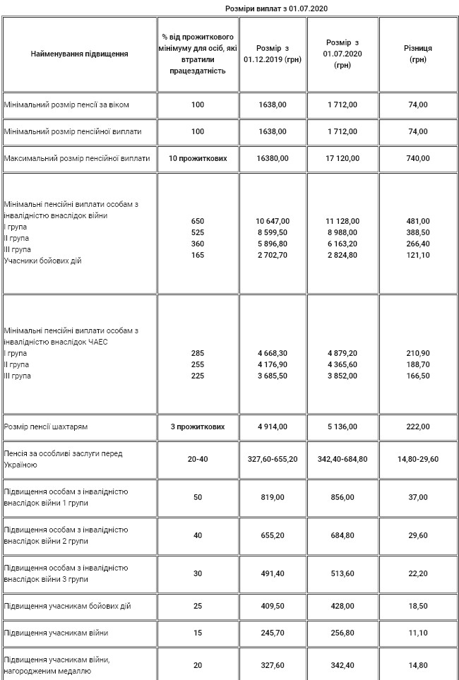 Пенсионный фонд провел перерасчет пенсионных выплат с 1 июля 2020 в связи с увеличением прожиточного минимума для лиц, утративших трудоспособность, с 1638 грн до 1712 грн.