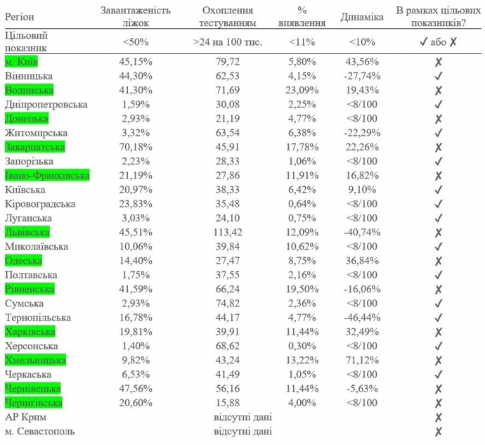 Киев, Львовская, Волынская, Закарпатская, Ивано-Франковская, Ровенская, Одесская, Хмельницкая, Черновицкая, Черниговская, Харьковская и Донецкая области имеют эпидемические показатели, которые не позволяют ослаблять карантин.