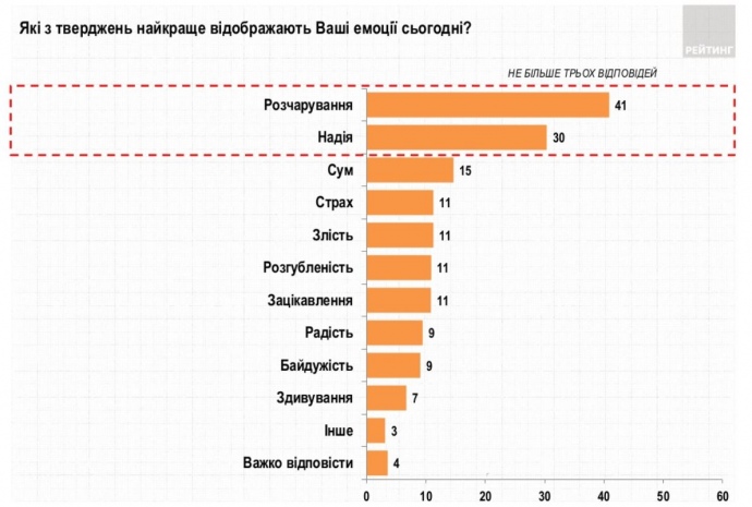 Дословно: "Среди эмоций, которые лучше всего отражают состояние, крупнейшими оказались разочарование (41%) и надежда (30%). Далее идут - печаль (15%), страх, злость, растерянность, интерес (по 11%), радость и безразличие (по 9%), удивление (7%)".
