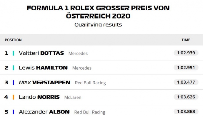 Финский пилот Валттери Боттас выступающий за команду Mercedes, показал лучшее время в квалификации Гран-при Австрии, стартового этапа чемпионата мира по автогонкам класса "Формулы-1" в 2020 году.
