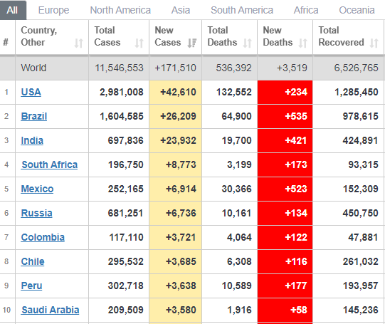В этот день умерли 3519 человек, у которых диагностировали коронавирус. В частности, в Бразилии жертвами болезни стали 535 человек, в Мексике – 523, в Индии – 421, в США – 234, в Перу – 177, в Южной Африке – 173.