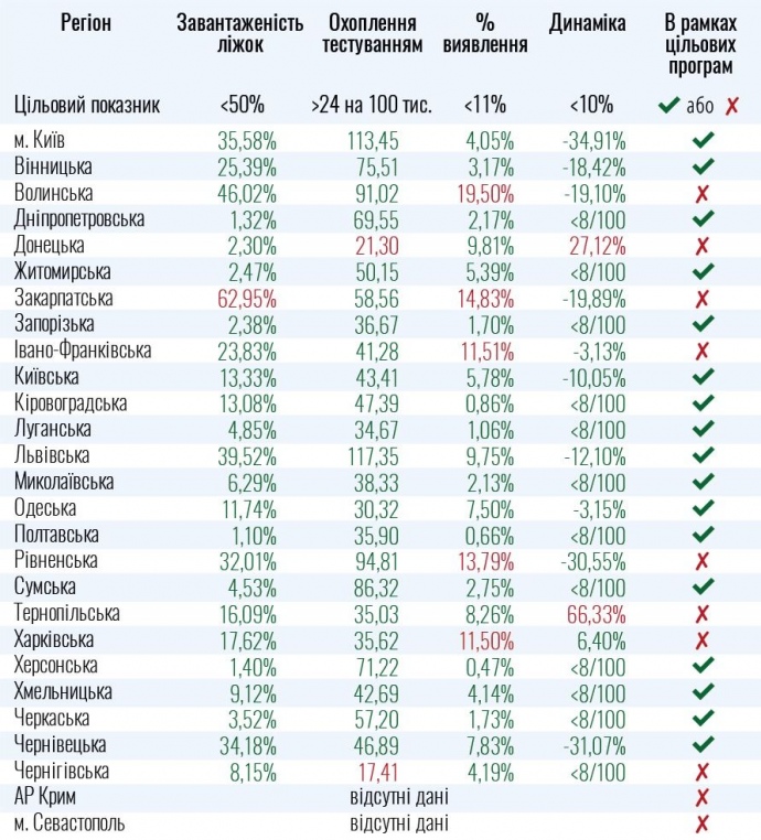 Переход областей к следующему этапу карантина, который предусматривает ослабление карантина, возможен при условии соответствия эпидситуации в области 4 критериям: загруженность коек; среднее количество тестирований – не менее 24 на 100 000 населения за 7 дней; коэффициент выявления случаев инфицирования COVID-19 – более 11%; динамика роста случаев – более 10% (последний показатель применяется в случае регистрации более 8 случаев на 100 000 населения за 7 дней).